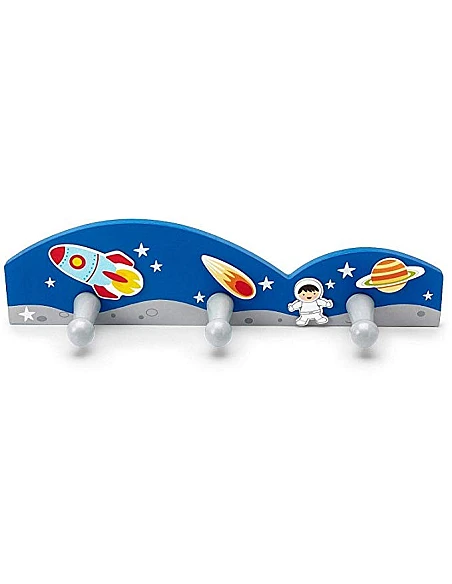 Flot håndlavet knagerække i rum og planet design. Designet med astronaut og rumskib er et bedårende og dekorativt design til børneværelset. Praktisk til det lettere børnetøj, jakker, tasker og badekåber. Et sjovt og sødt tilbehør til børneværelset med flotte rum og planet motiver.