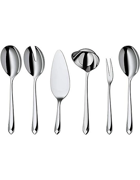 12 x Spiseskeer 12 x Spisegafler 12 x Spiseknive 12 x Teskeer 12 x Kagegafler 1 x Kage/Tærtespade 1 x Salatbestik (2 Dele) 1 x Sovseske 1 x Serveringsske 1 x Serveringsgaffel |