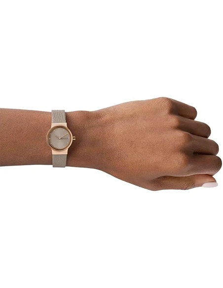 Skagen UreSkagen Freja Lille SKW3005 med grå urskive og grå læderrem. Kvarts urværk, let og behagelig pasform i en underspillet, nordisk stil. Den slanke profil og mineralglas gør det nemt at bære hele dagen, mens kvaliteten føles gennemført.