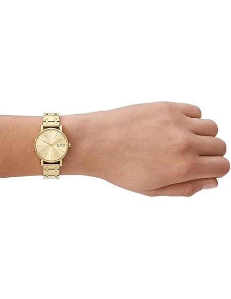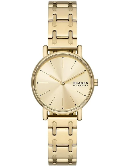 Skagen Signatur dameur kombinerer enkel elegance med en guldtonet urskive og solidt rustfrit stål. Uret er vandtæt op til 50 meter og har et slankt design, perfekt til både hverdagsbrug og festlige anledninger. Det tidløse design gør det til et fantastisk tilbehør, der komplimenterer enhver stil.