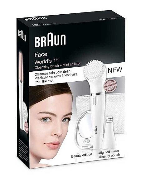 Braun Face, kombinerer 2 ansigtsbehandlinger i 1 med en enkel batteridrevet maskine, som nænsomt dybderenser og epilerer selv de fineste små hår. Denne enestående deluxe beauty edition kommer med fin lædertaske til opbevaring, samt et oplyst spejl. Braun Face dybderenser, og fjerne makeup rester og urenheder 6 x mere effektivt end manuel ansigts rensning.