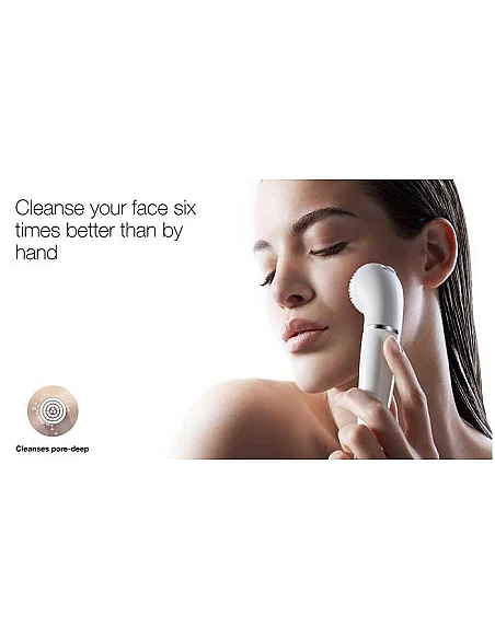 - Forfiner og ex folierer via mikrosvingninger (hundredvis af svingninger i minuttet) med børsten, som nænsomt og effektivt renser selv den mest følsomme hud.