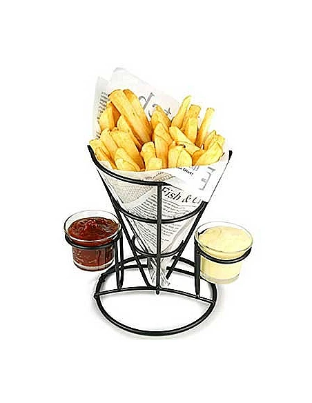 Smart holder i Retro stil til f.eks. pommes frites, løgringe m.m. Holderen kommer med 2 glas til dyppelse som kan bruges til ketchup, mayonnaise eller anden dip. Server pomfritter med stil med denne franske kegle.