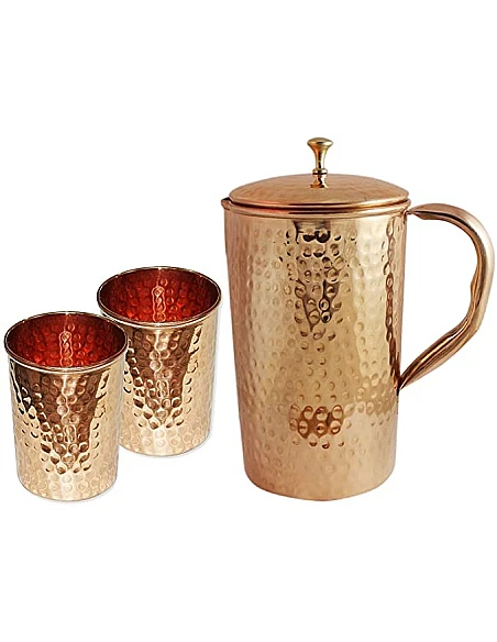 Dekorativt kandesæt med tilhørende drikkekrus i ægte kobber. Designet med hammerslags effekt giver et spændende og dekorativt udtryk til både krus og kande. Sættet er fremstillet i rent letvægts kobber uden belægning, og giver sundt drikkevand dagen lang.