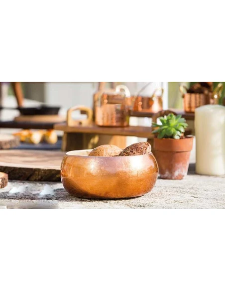 Den kobberbelagte skål giver et varmt og overdådigt udtryk. Den skiller sig ud fra det rustikke indre af bambus med unik, naturlig årer. Bambus er naturligt robust, vil denne skål holde i lang tid.