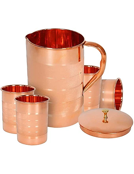Stilfuld og praktisk kobber kande i håndlavet indisk design. Kanden kommer med 4 enkle krus der kan stables og samles i kanden for smart opbevaring eller når den medbringes på ferie i sommerhus, campingvogn eller bare i det lille hjem. Sættet er fremstillet i ægte let kobber både udvendigt og indvendigt.