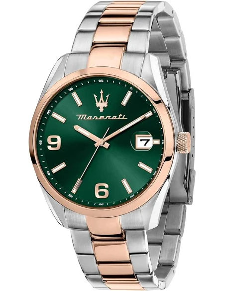 MaseratiMaserati Attrazione R8853151020 har grøn urskive med rosaguld detaljer og kvarts urværk. Stålkasse på 43 mm, tofarvet lænke og 5 ATM vandtæthed gør den velegnet til daglig brug med tid og dato let aflæst.