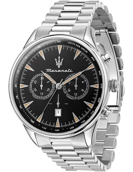 MaseratiMaserati Tradizione R8873646004 er en 45 mm kvarts kronograf i stål med sort skive. Mineralglas, ca. 11,95 mm tykkelse og 10 ATM vandtæthed giver solid hverdagsholdbarhed. Stållænke fuldender det klassiske udtryk.