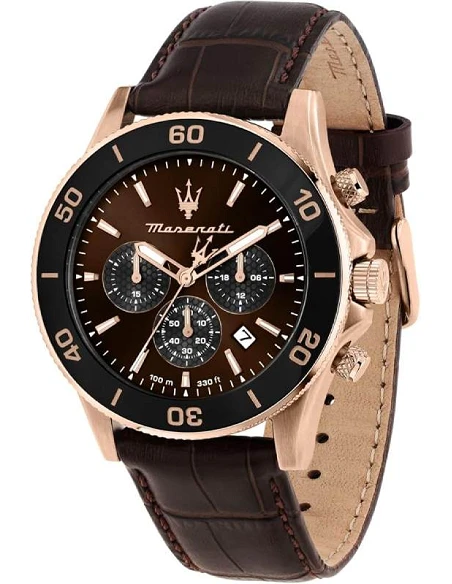 MaseratiMaserati Competizione R8871600001 giver et sportsligt udtryk med stålkasse, kronograf og kvarts urværk. Den naturlige læderrem sidder blødt på håndleddet, mens mineralglas beskytter skiven. Et sikkert valg til dig der vil have sporty stil og enkel betjening i hverdagen.