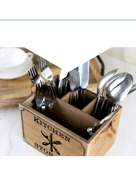 Vintage Køkkenredskabsbeholder i Træ med Læderhåndtag og 4 rum tilføjer både funktionalitet og stil til dit køkken.