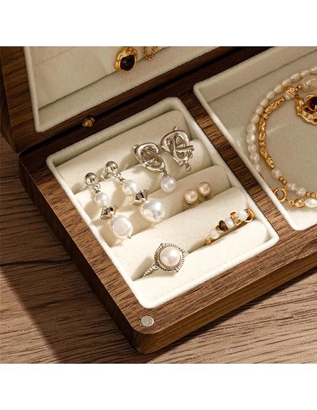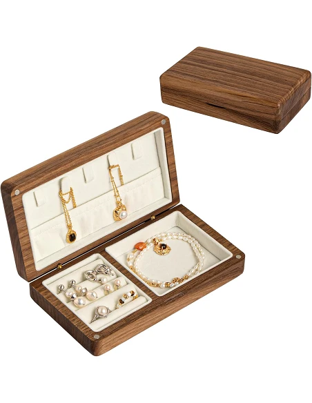 Boksen er håndlavet i valnøddetræ af høj kvalitet med en lækker, blød velourforing, så dine smykker beskyttes mod ridser og holdes pænt organiseret. Den er både praktisk og elegant, ideel som gave eller forkælelse til dig selv.