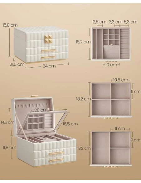 | Særlige funktioner | Plads til op til 10 halskæder i låget, spejl til makeup, fleksibel ørestik-organisator |