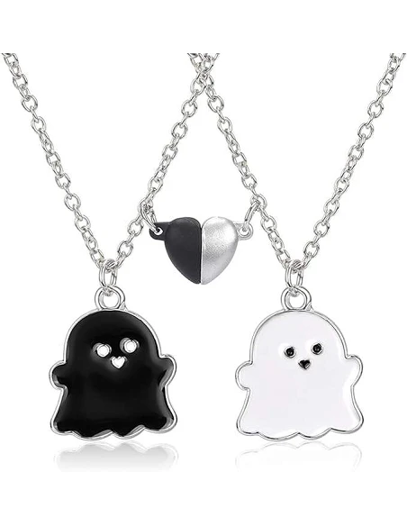 Denne søde halskæde kommer som et sæt med to, så dit barn og hendes bedste ven kan bære hver sin. De små spøgelsesvedhæng i sort og hvid har et hjerte i midten og passer sammen som et puslespil. Inde i vedhængene er der magneter, så de finder hinanden, når man sætter dem tæt sammen. Det føles som et lille tegn på, at venskabet altid er der.